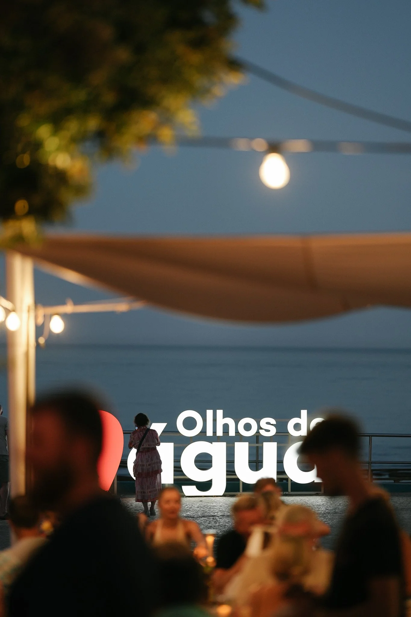 Pessoas sentadas ao ar livre em um ambiente à noite, com luzes suspensas e uma vista para o mar ao fundo, com uma placa que diz "Olhos de água".
