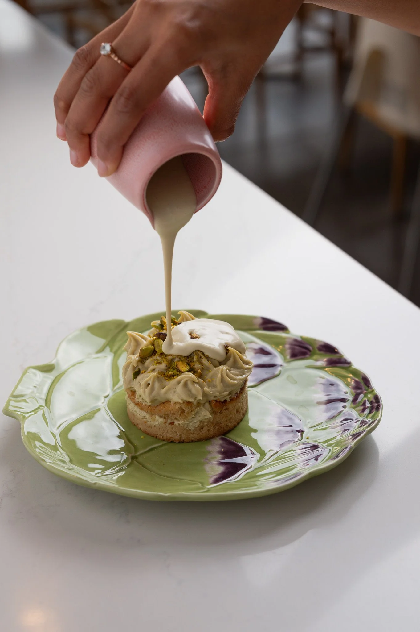 Pessoa despejando calda pistachio sobre um tiramisu de pistachio decorado com creme e pistachos em um prato decorativo verde com detalhes roxos