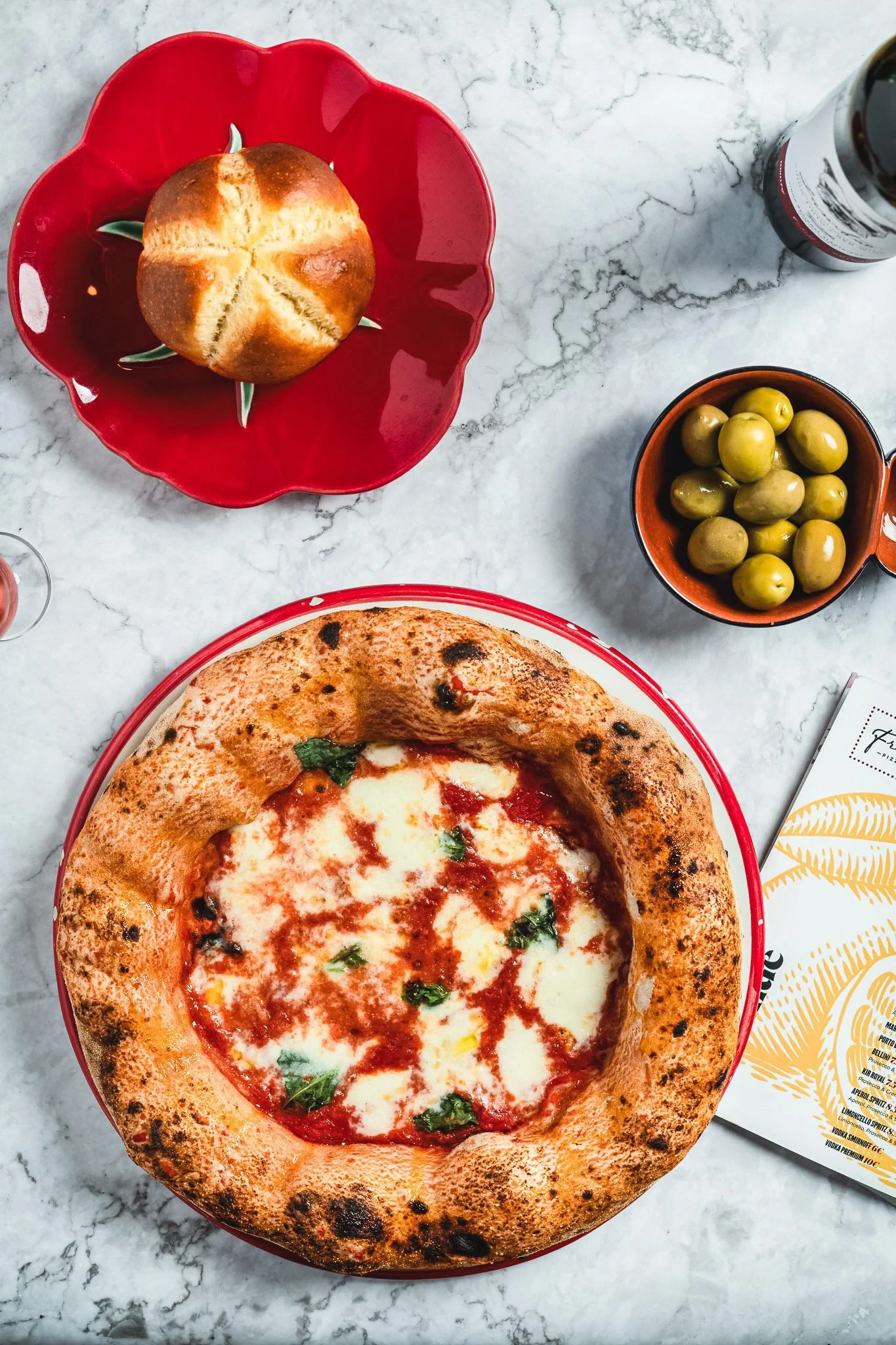 Pizza margherita com borda queimada, acompanhada de pão, azeitonas verdes, e uma bebida. Itens sobre uma mesa de mármore.